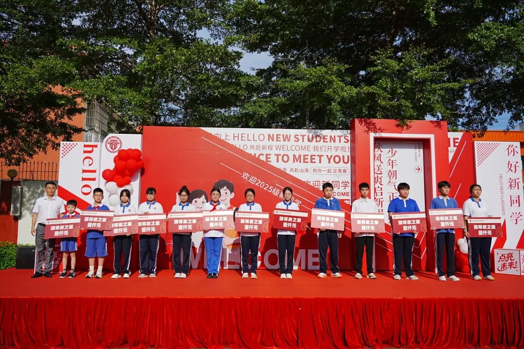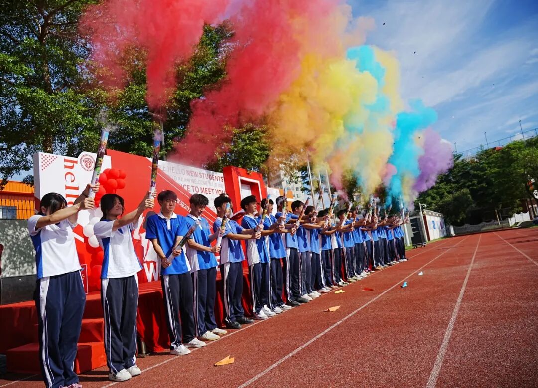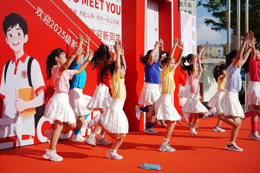 九月的珊外,秋阳高照。迎新打卡点、启智红门、背景红墙与和谐的“珊外红”交相辉映。“我是一个兵”的主题打卡墙、“阅兵史长廊”烘托出了爱国的热情。2025级小一、初一、高一新生手执小红旗和“和平鸽”,穿过“迎新门”迈进典礼现场!全校师生亲手折制的2000多只“和平鸽”腾空飞翔,放飞的是对世界和平的祈愿,开学典礼的现场秒变成珊外欢腾的海洋。